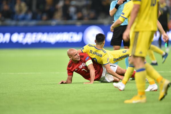 Казахстанцы отлично начали матч: уже на 7-й минуте Бауыржан Исламхан мог открывать счет прямым ударом со штрафного, на 15-й Алексей Щеткин неточно пробил головой. К середине тайма грузины освоились и тут же провели две опасные атаки: костанаец Нике Квеквескири проверил астанчанина Ненада Эрича дальним ударом, а вскоре спас Дмитрий Шомко, в неразберихе в штрафной и у ворот выбивший мяч с линии – момент, кстати, пришел с того же правого фланга Бейсебекова – Жукова. Наши ответили похожим суматошным моментом.