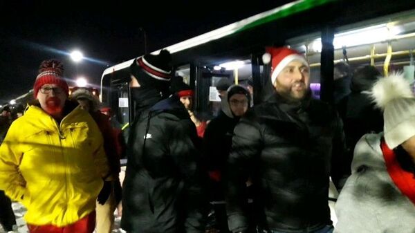 Группа фанатов "Манчестер Юнайтед" привезла с собой новогоднее настроение. В толпе задорно пел даже Санта Клаус.