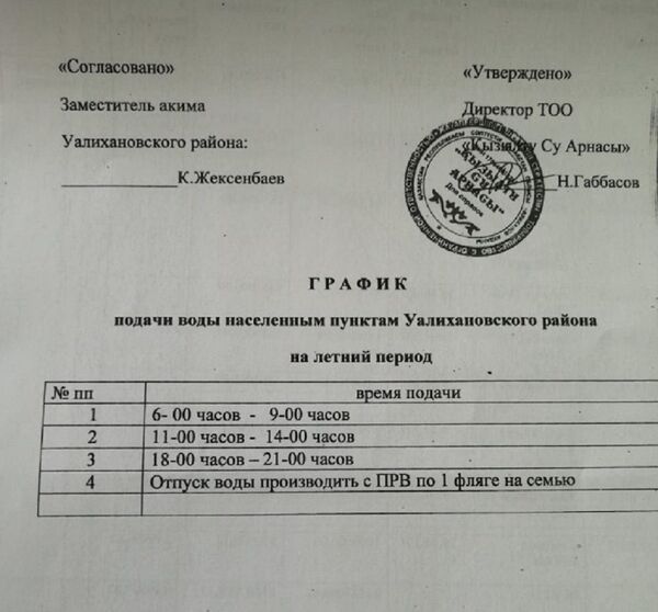 "В нашем районе на лето установлен такой график подачи воды: с 6 до 9 часов, с 11 до 14, с 18 до 21 часа. Причем с пункта раздачи воды предусмотрен отпуск всего по одной фляге на семью. В Кишкенеколе (районном центре) вода в эти часы бежит нормально, а у нас же даже в часы подачи вода бежит тоненькой струйкой, без напора", - рассказали жители села Кондыбай.