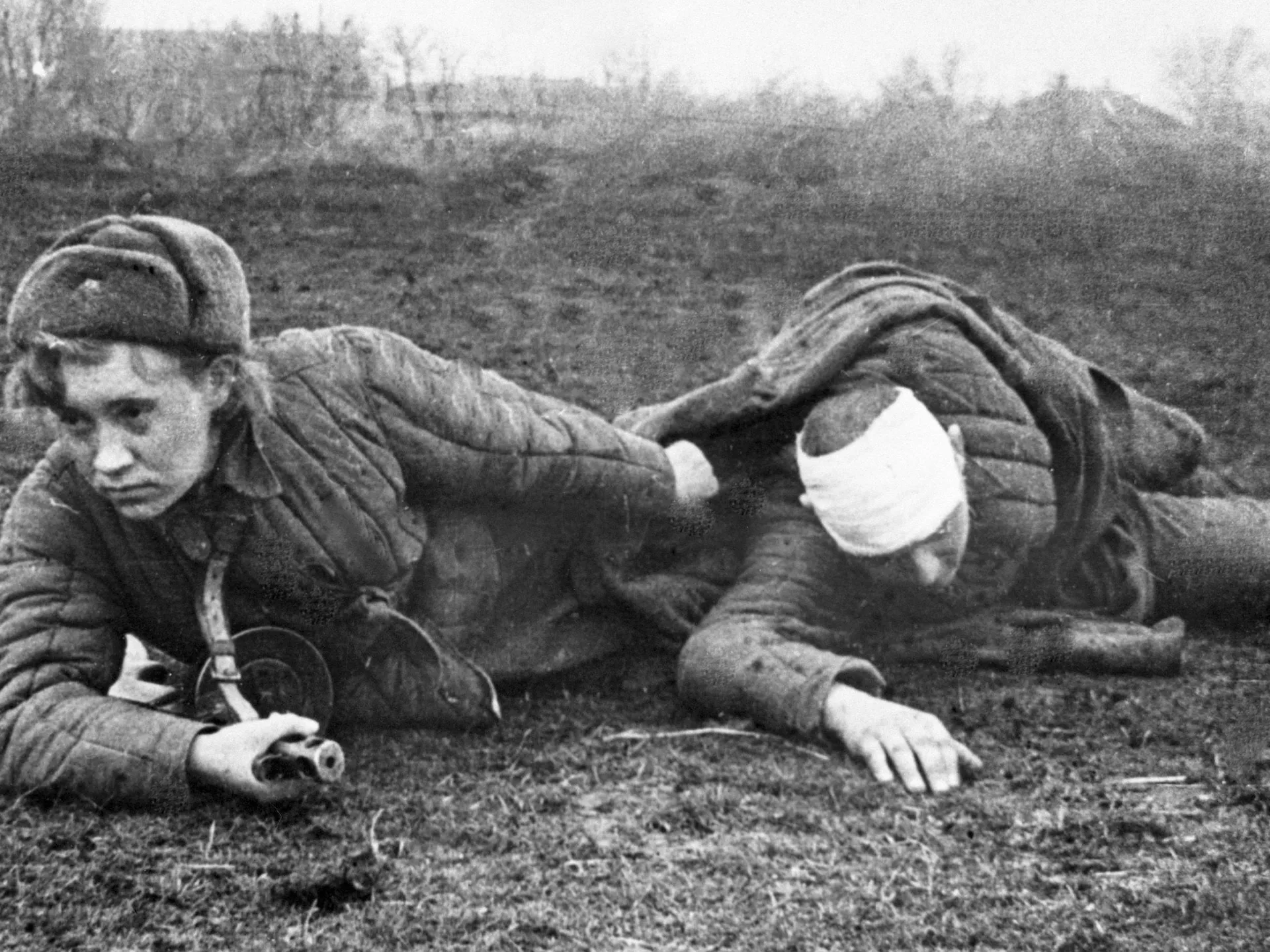 Они героически шли в бой наравне с советскими солдатами, вытаскивая раненых с поля боя, закрывая их собой от свистящих пуль. На фото: медсестра партизанского отряда имени Г. И. Котовского перевязывает раненого во время боя.