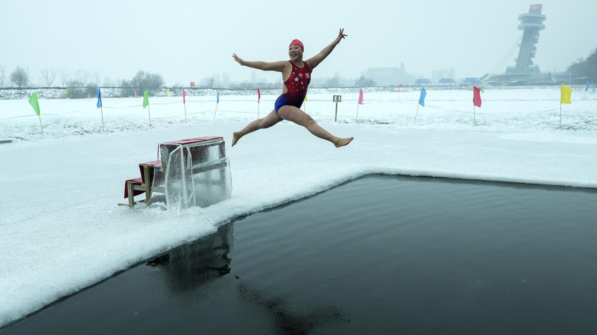 © AP Photo / Andy Wong Юй Сяофэн прыгает в прорубь на замерзшей реке Сунгари в Харбин, Китай.
