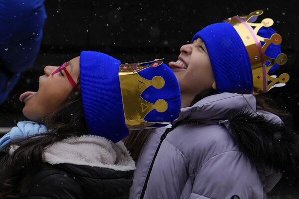 Дети ловят снежинки языками во время ежегодного парада в честь Дня трех королей в в Нью-Йорке, США.