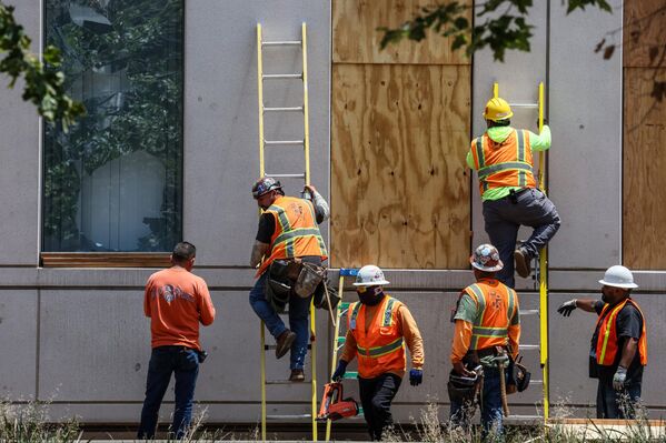 На фото: рабочие ремонтируют разбитые окна в полицейском управлении на Спринг-стрит, Лос-Анжелес.