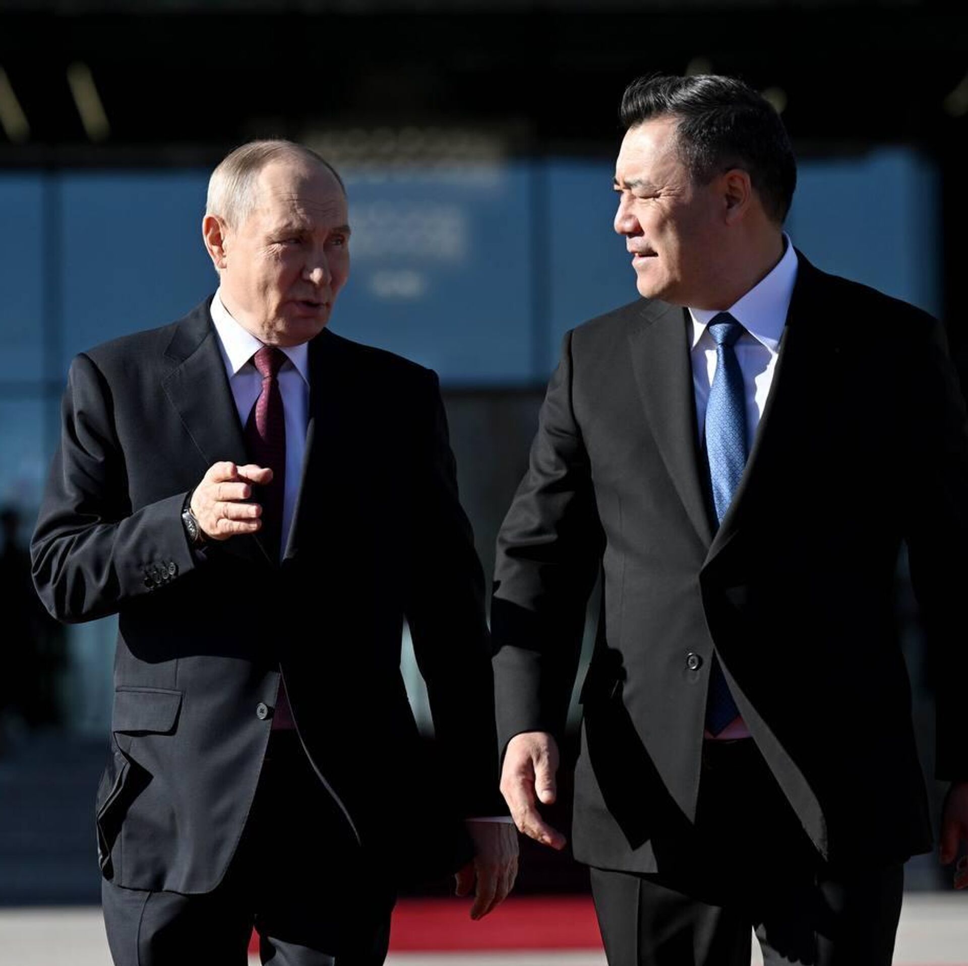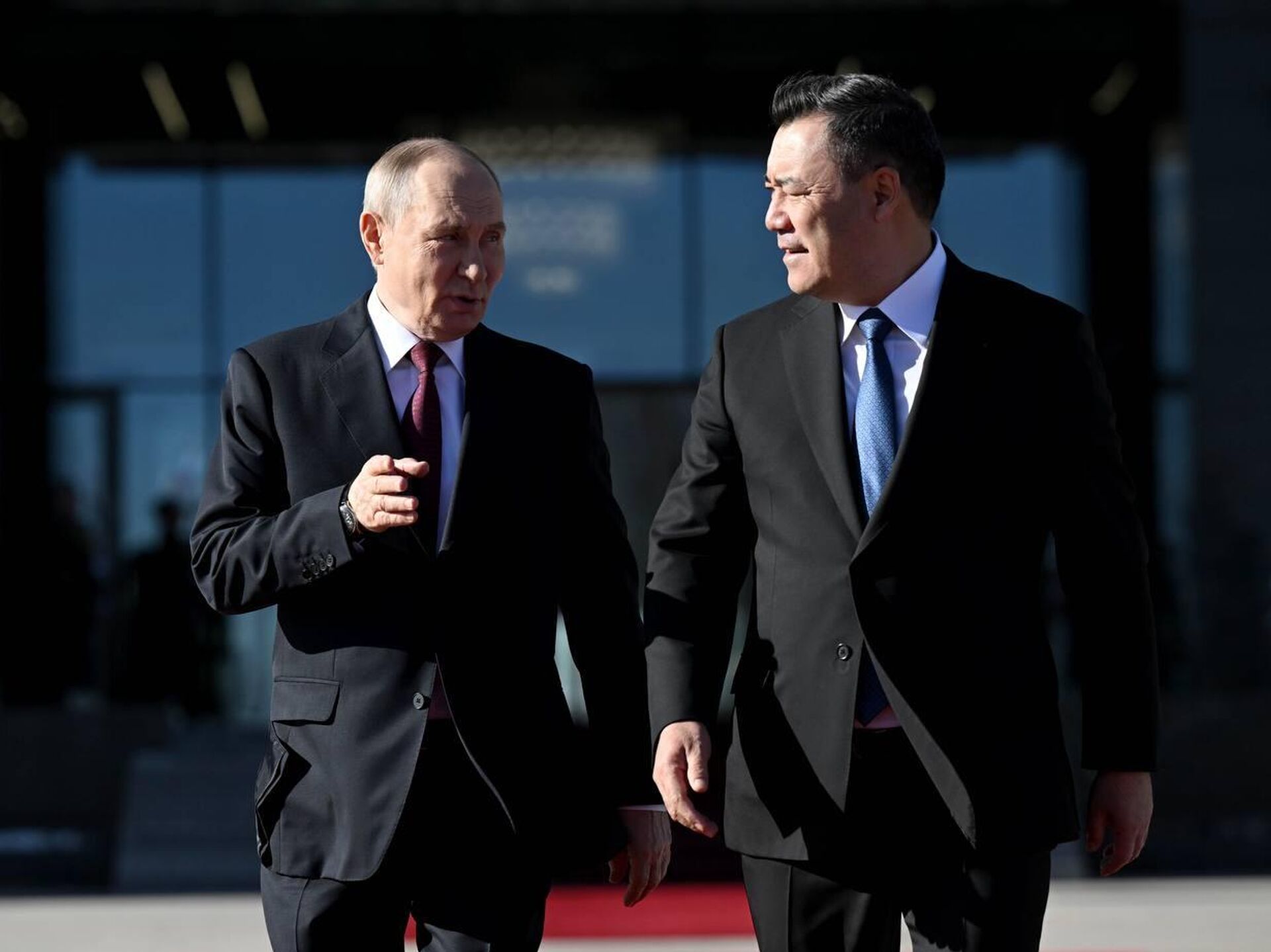 На красной дорожке у резиденции "Ынтымак ордо" Владимира Путина встретил Садыр Жапаров.