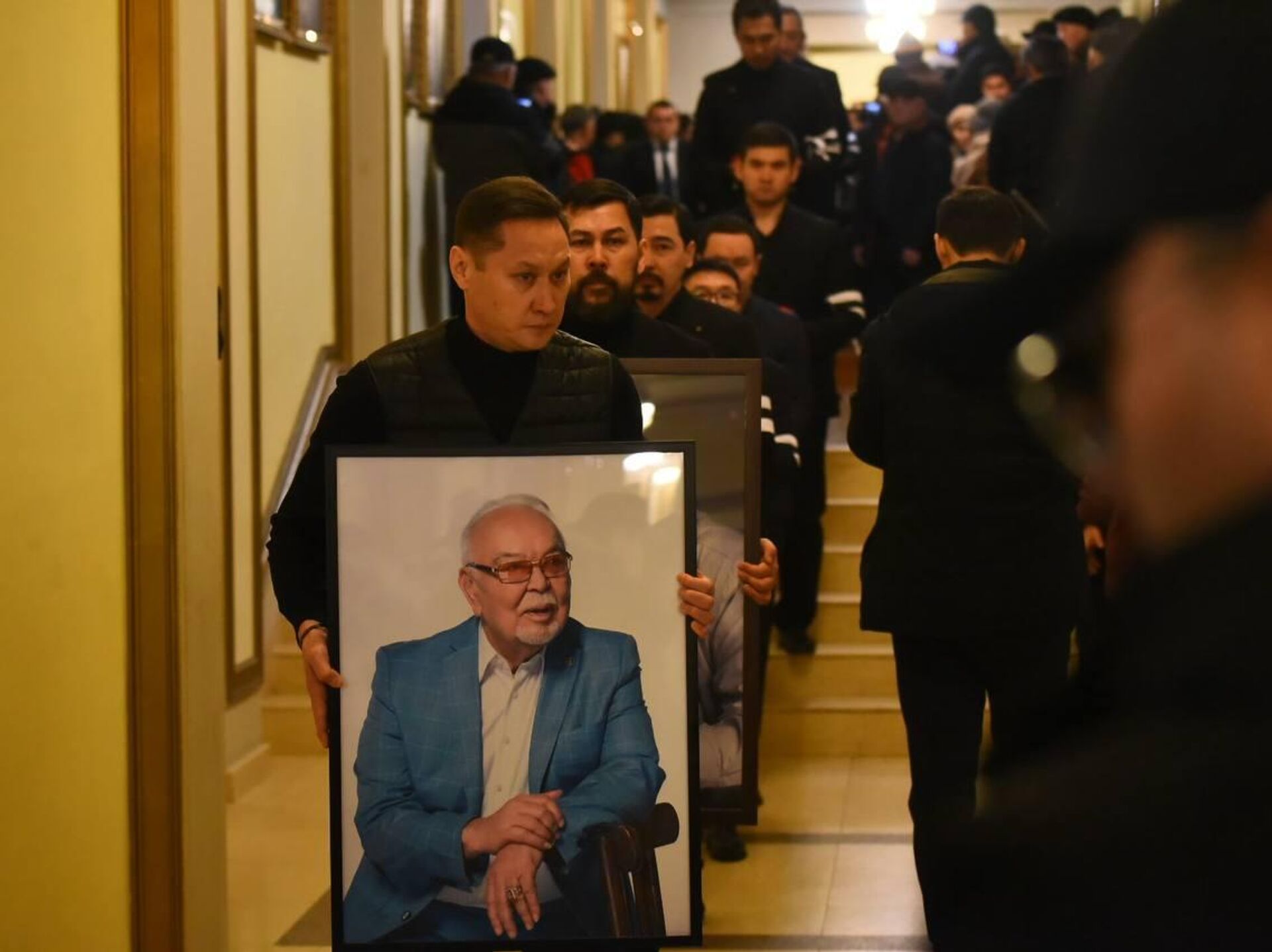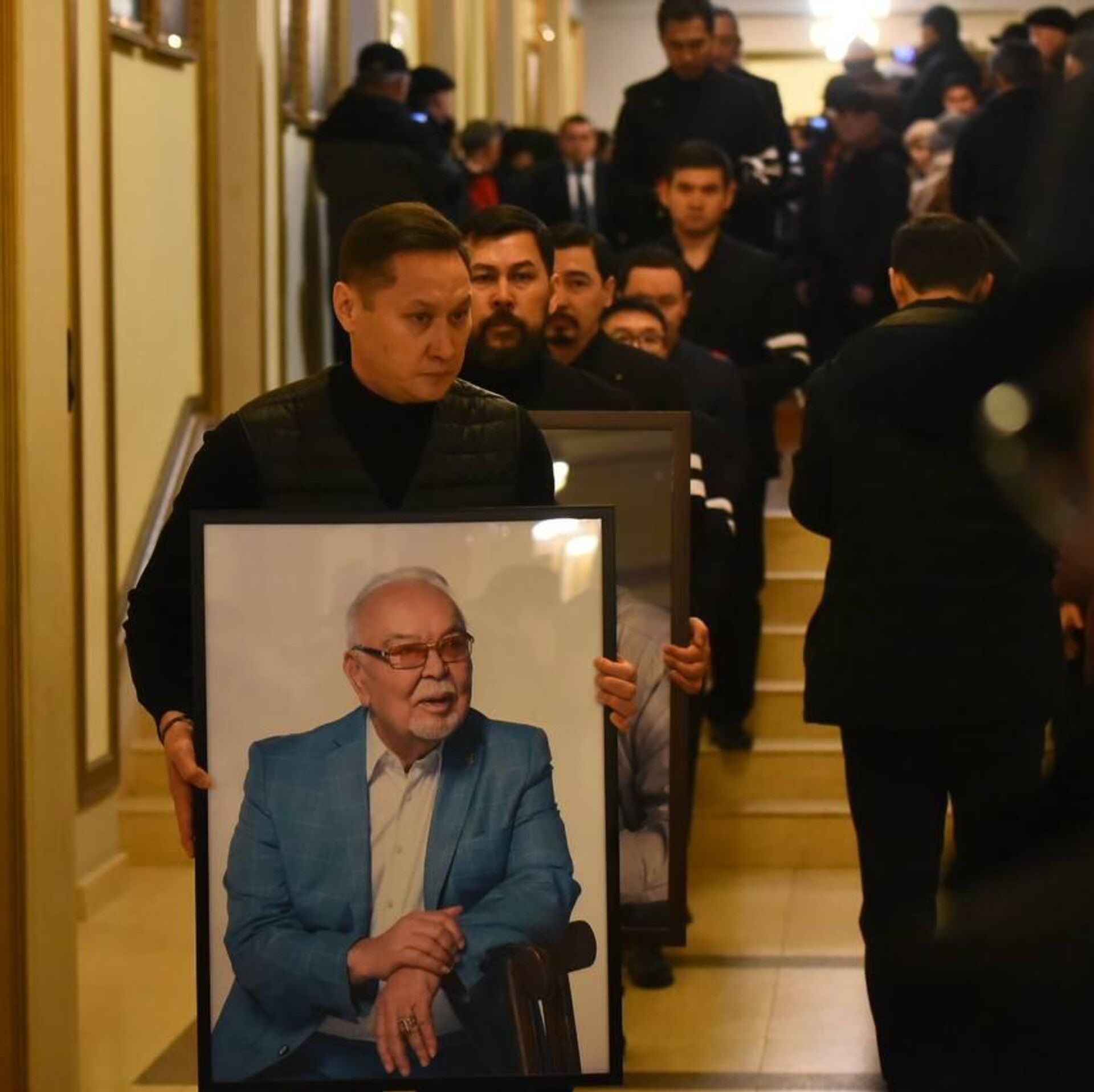 На сцене участниками траурной церемонии стали госсекретарь Ерлан Карин, вице-премьер - министр культуры и информации Аида Балаева, а также аким Алматы Дархан Сатыбалды.
