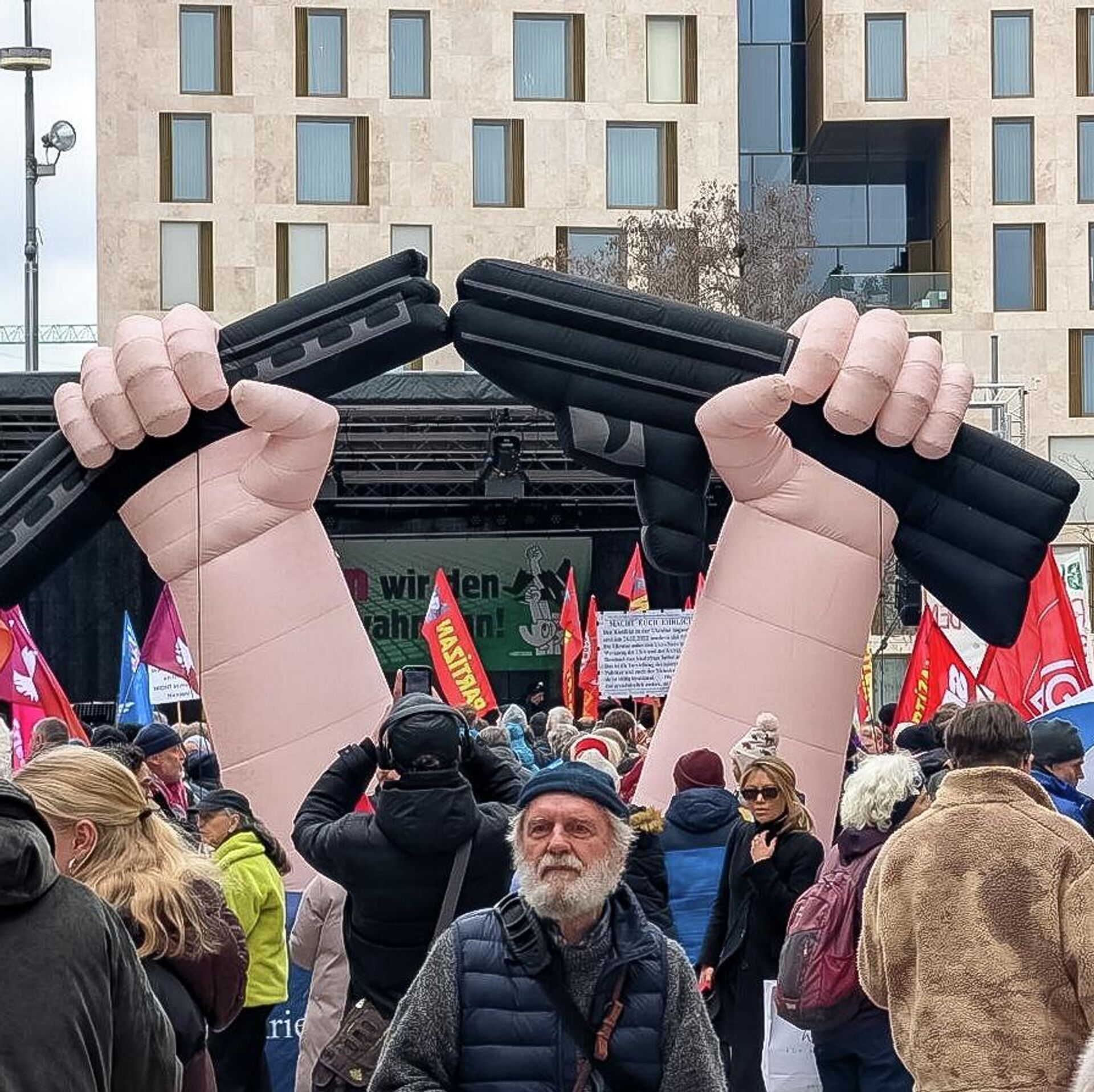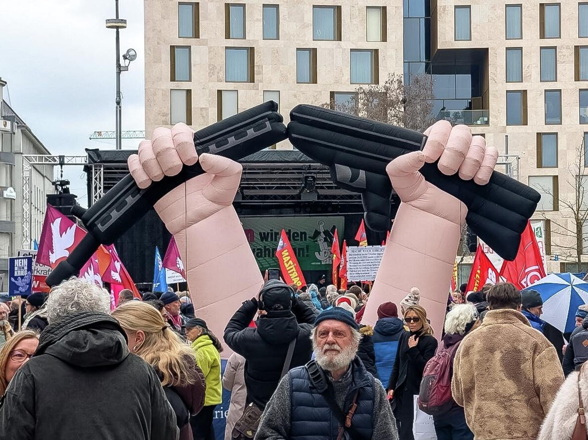 Протестующие принесли совмещенные германо-российские флаги дружбы, знамена Палестины, баннеры и плакаты с призывами к миру, отказу от поставок оружия Украине и Израилю. Участники намерены окружить место проведения конференции.