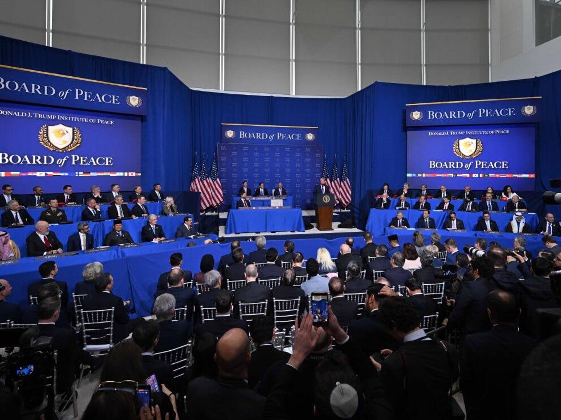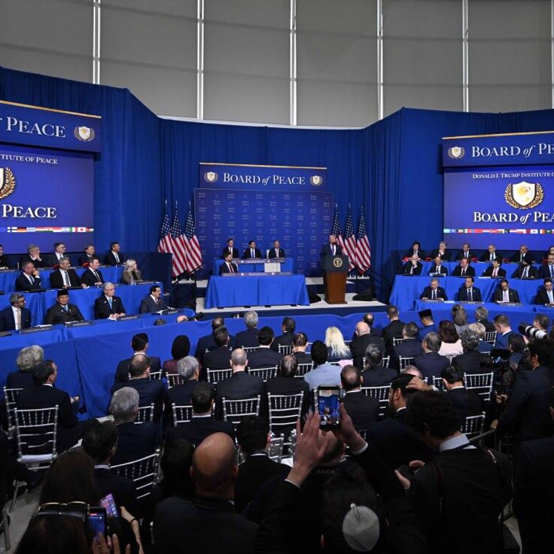 "Я рад сообщить, что Казахстан, Азербайджан, ОАЭ, Марокко, Бахрейн, Катар, Саудовская Аравия, Узбекистан и Кувейт, все они внесли более семи миллиардов долларов в пакет помощи (Газе - Sputnik)", - заявил американский лидер, выступая на первом саммите "Совета мира" в Вашингтоне.