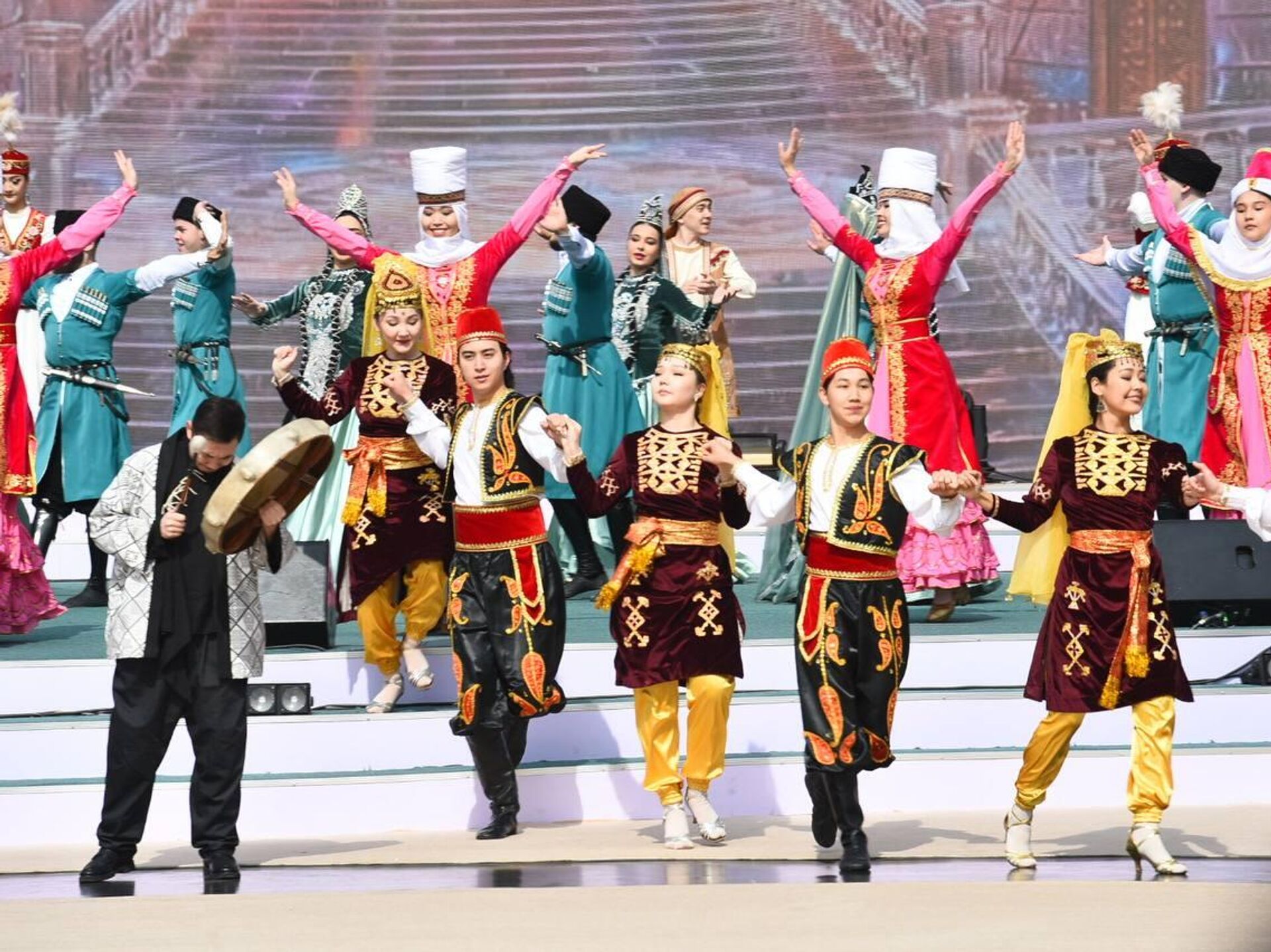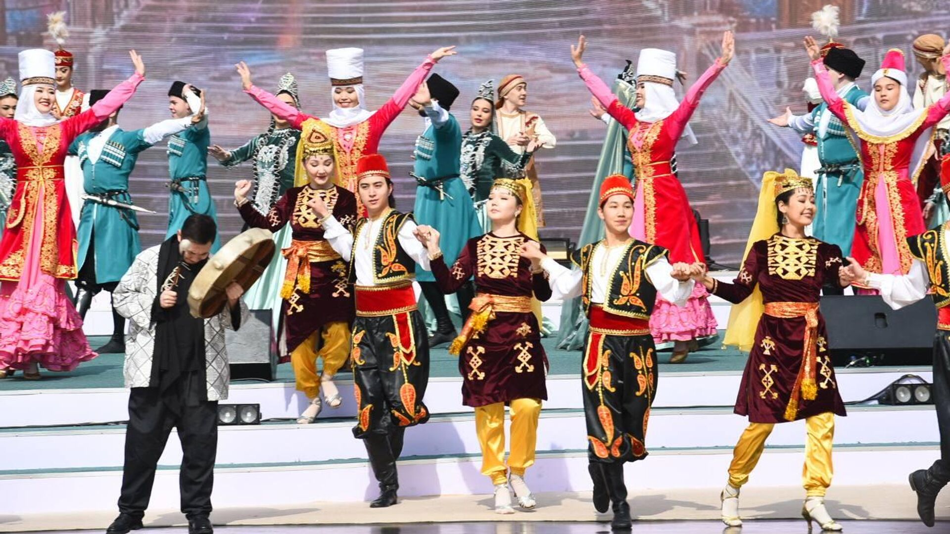 Концертная программа открылась выступлениям артистов в национальных костюмах, красочное зрелище наблюдали жители и гости Алматы.
