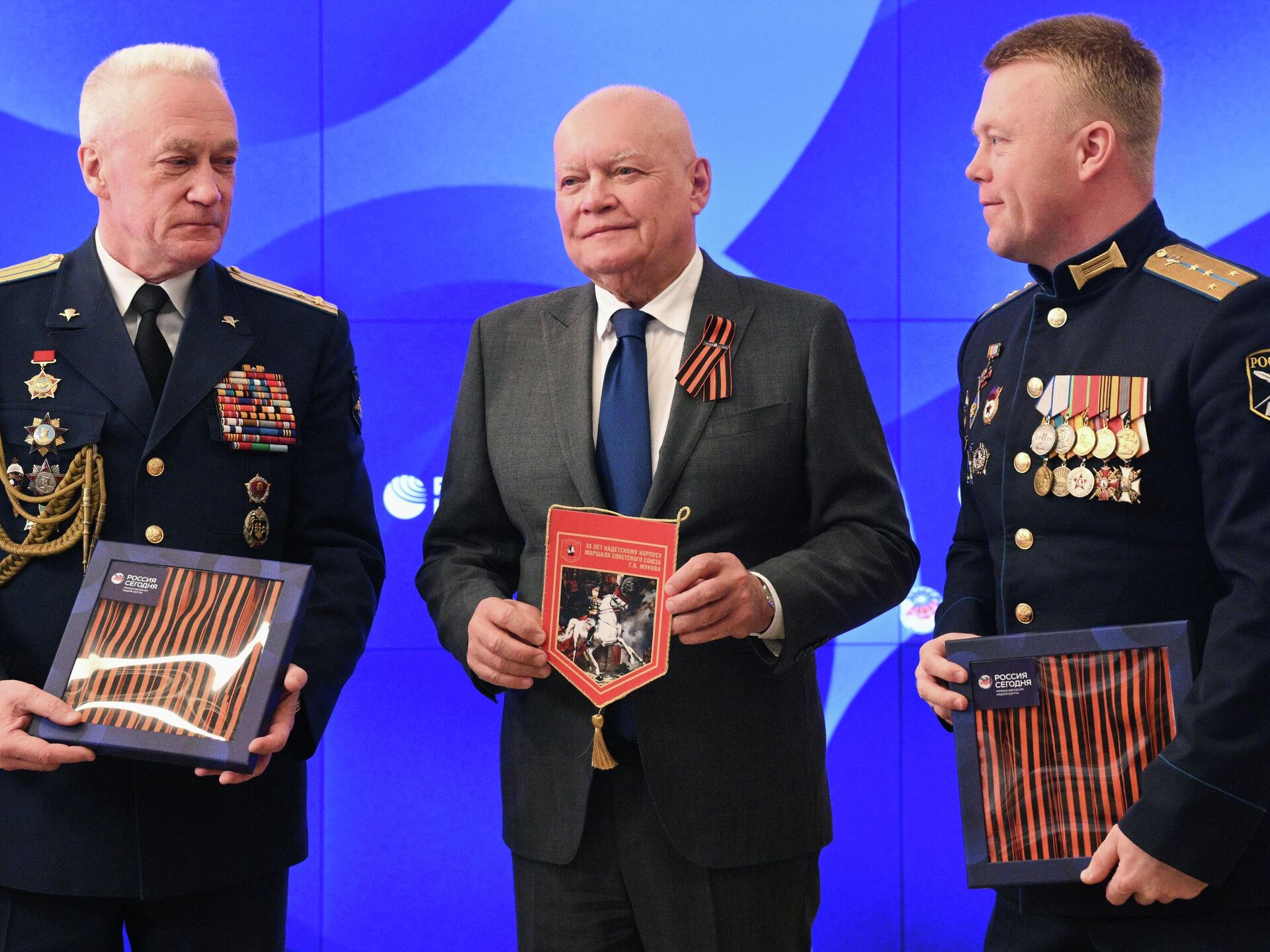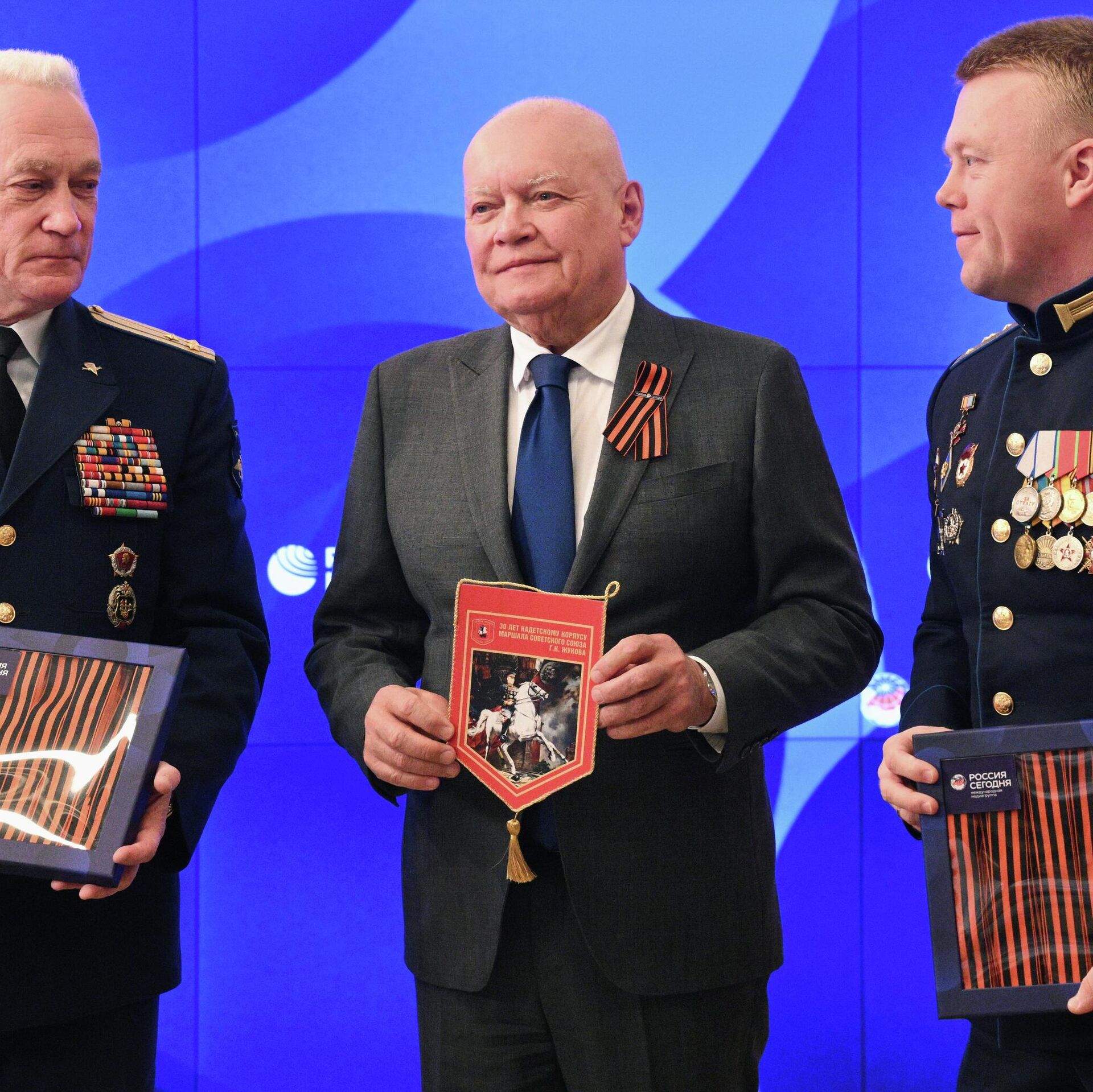 Руководитель Кадетского направления ГБОУ школы №1409 Виктор Бондюков, гендиректор МИА "Россия сегодня" Дмитрий Киселев и участник СВО Иван Бондюков