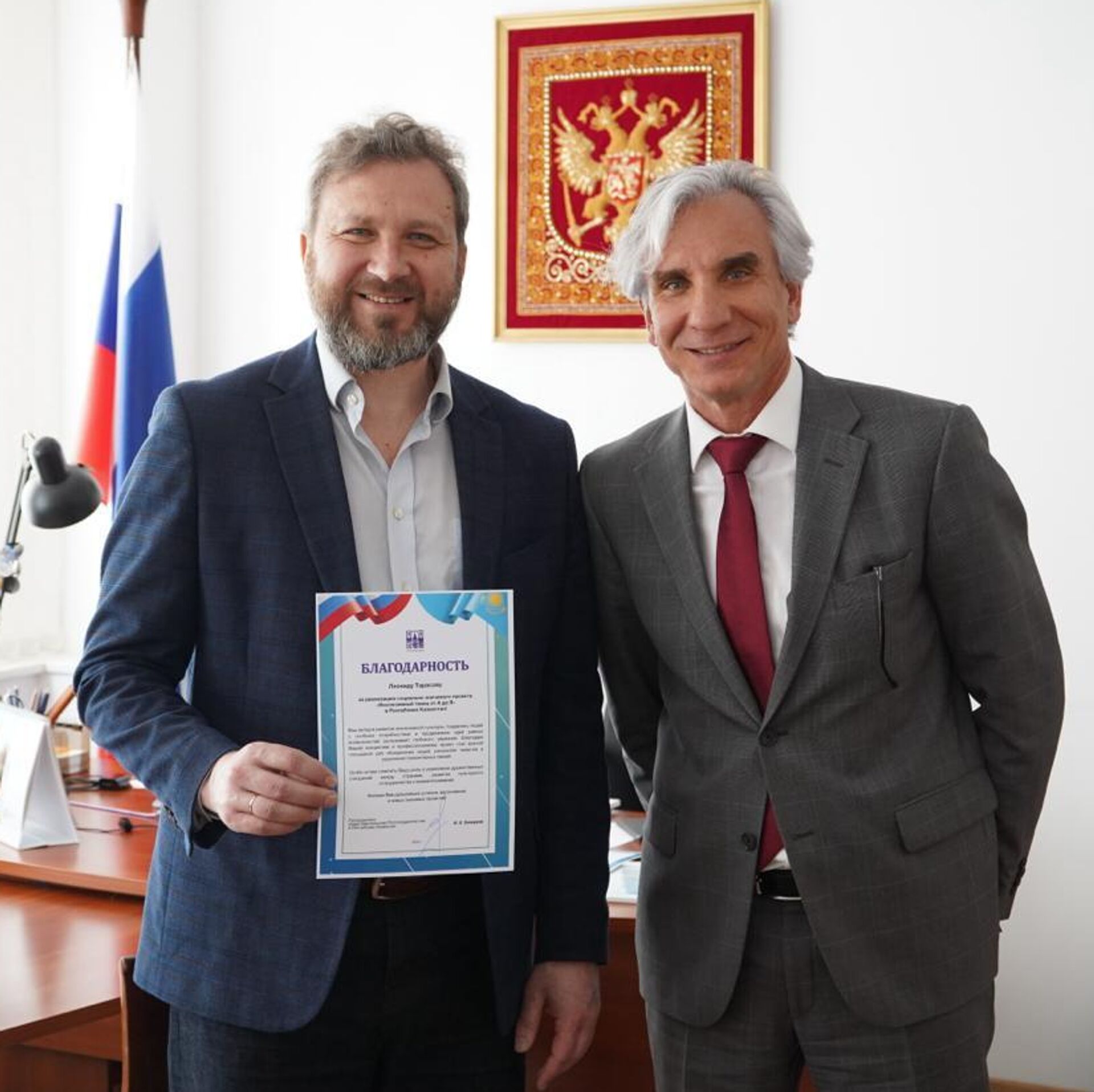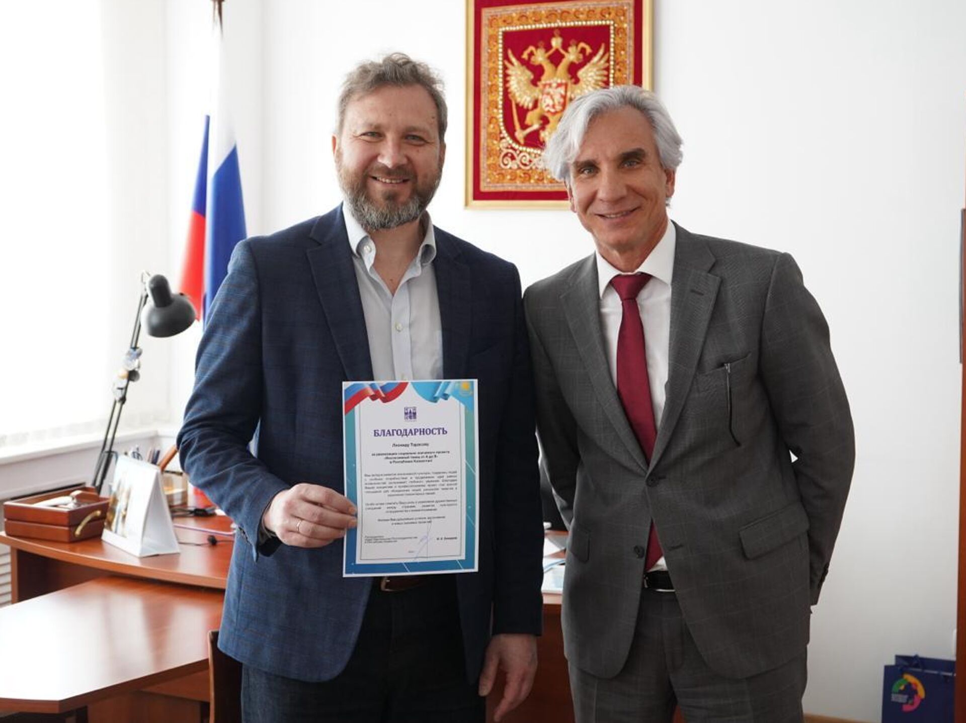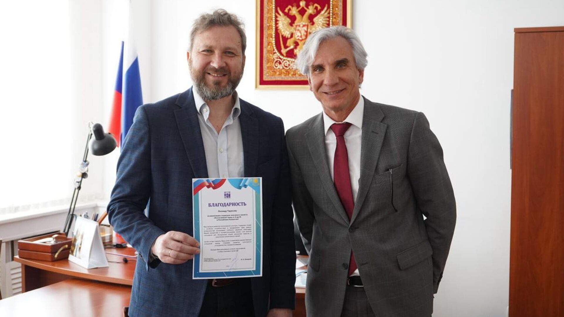 Идеолог проекта "Инклюзивный танец от А до Я" Леонид Тарасов и руководитель представительства Россотрудничества в Казахстане Ирек Зиннуров